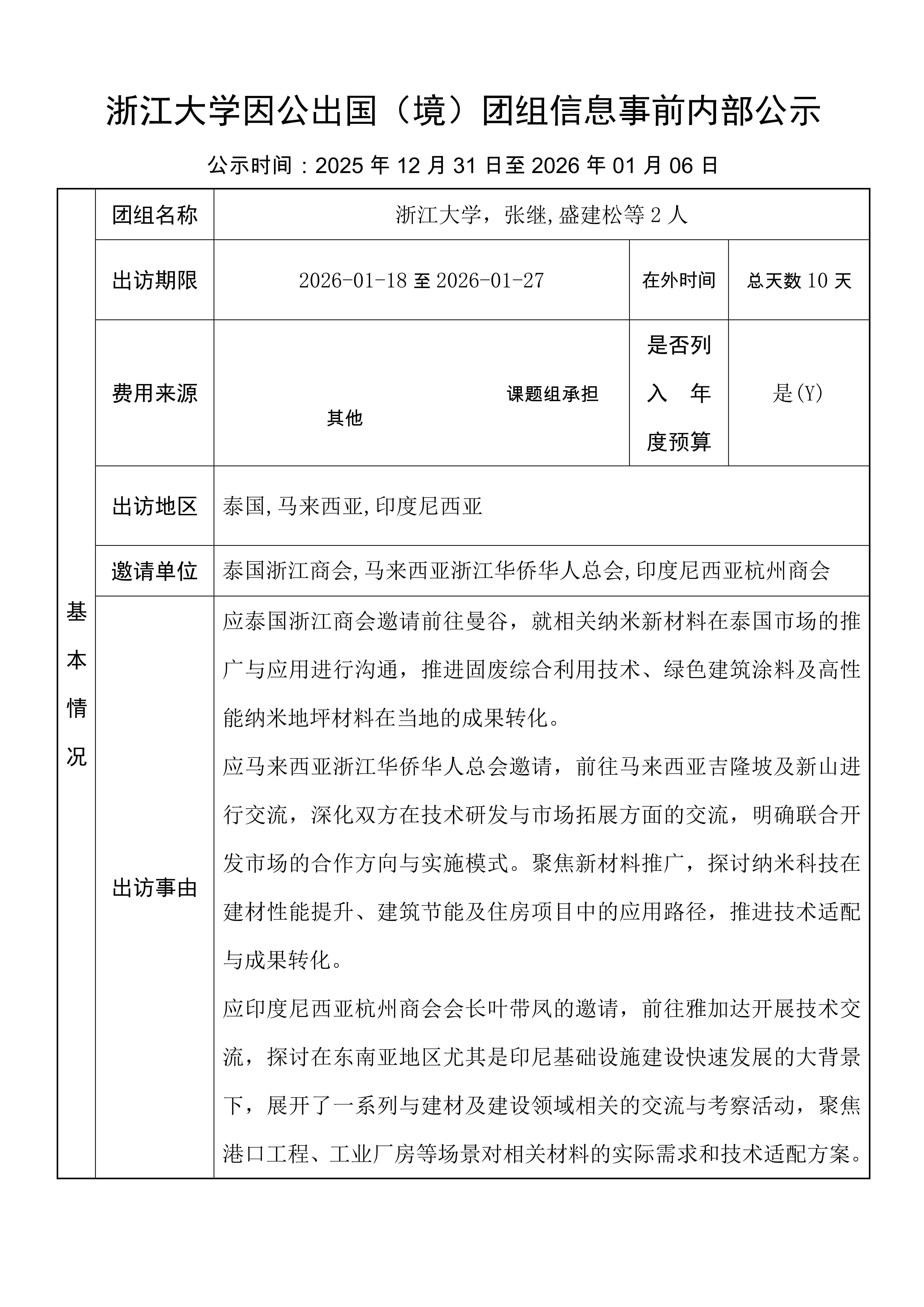 浙江大学因公出国(境)团组信息事前内部公示