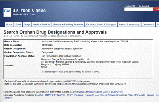 2025年4月15日,杭州荣泽生物科技集团有限公司(以下简称“荣泽生物”)自主研发的全球首款Fisrt-in-Class基因治疗产品 RZ-g001BE 碱基编辑注射液(简称“ RZ-g001BE”)获得美国食品药品监督管理局(简称“FDA”)孤儿药资格认定(Orphan Drug Designation,ODD),用于治疗长QT综合征(long QT syndrome, LQTS)。这也是全球首款获得FDA孤儿药资格认定的遗传性心肌病体内基因治疗药物,是碱基编辑疗法首次在心肌病领域的探索性研究,为LQTS相关临床研究工作奠定重要的基础,实现了该领域的重大突破。