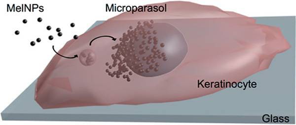 为了合成这种黑素体,加利福尼亚大学圣迭戈分校的研究人员将多巴胺(一种在大脑和人体其他部位发现的神经递质)浸泡在碱性溶剂中。这一步骤产生了类黑色素纳米颗粒,这些纳米颗粒的外壳与内核由聚多巴胺(一种多巴胺基聚合物)组成。当把这种合成的颗粒与人体角质细胞一同放入培养皿中时,纳米颗粒会被角质细胞吸收,并像天然黑色素一样,分布在细胞核周围。