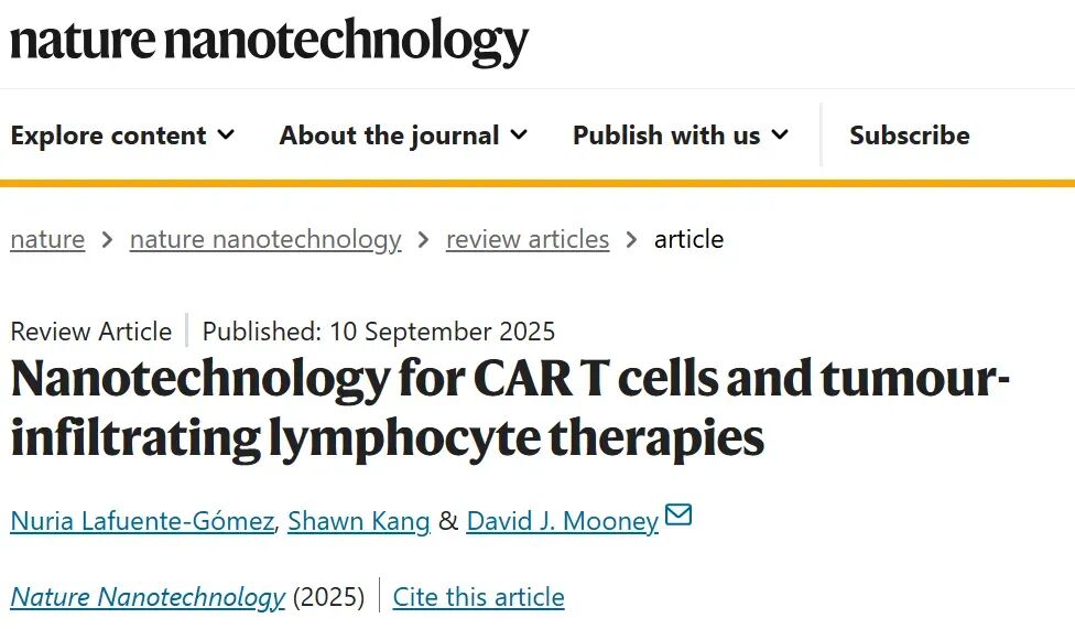 近期,哈佛大学David J. Mooney院士团队在《Nature Nanotechnology》期刊上发表了一篇题目为“Nanotechnology for CAR T cells and tumour-infiltrating lymphocyte therapies”的综述文章,总结了CAR T与TIL疗法的发展现状,探讨纳米技术如何在细胞制备、体内效能提升及直接体内CAR T生成等方面提供新的解决方案。