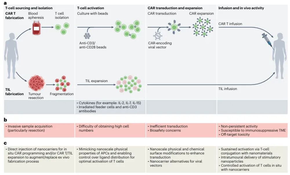图1: CAR T和TIL的现有制备流程及纳米技术的应用机遇。