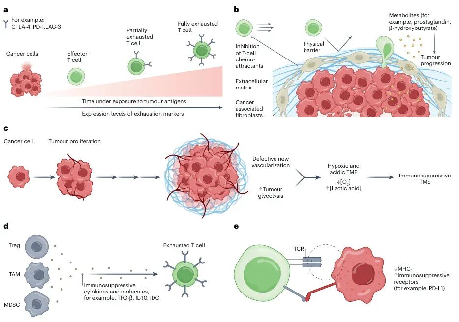 图3: 在肿瘤微环境中削弱抗肿瘤T细胞功能的障碍。