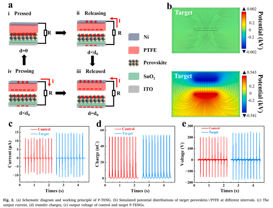 近年来,P-TENG领域涌现大量研究成果。例如王氏团队采用CsPbBr₃作为P-TENG的摩擦电层,系统探究了碱金属离子掺杂(Na⁺, K⁺, Li⁺, Rb⁺)[13]与卤素掺杂(Cl⁻)对材料摩擦电充电亲和力及极性的影响。苏氏团队利用钙钛矿材料的光敏特性,制备出基于MAPbI₃的自供电光探测器,其具有优异响应度、快速响应时间及宽广检测范围,为设计高性能自供电光探测器开辟了新路径[15]。随后,罗氏团队与王氏团队相继报道了由全无机钙钛矿(BiOI、CsBi₃I₁₀、Cs₃Sb₂Cl₃I₆)构成的系列光增强型P-TENGs,通过优化耦合效应与提升表面电荷密度实现性能提升。