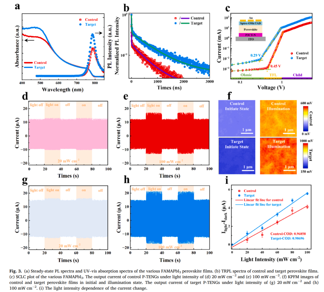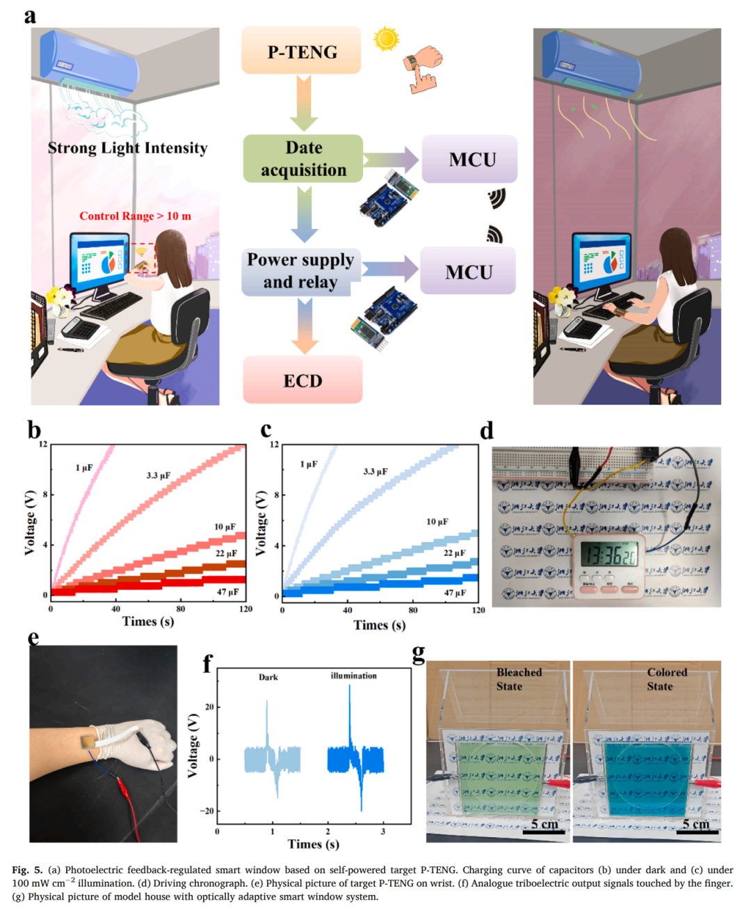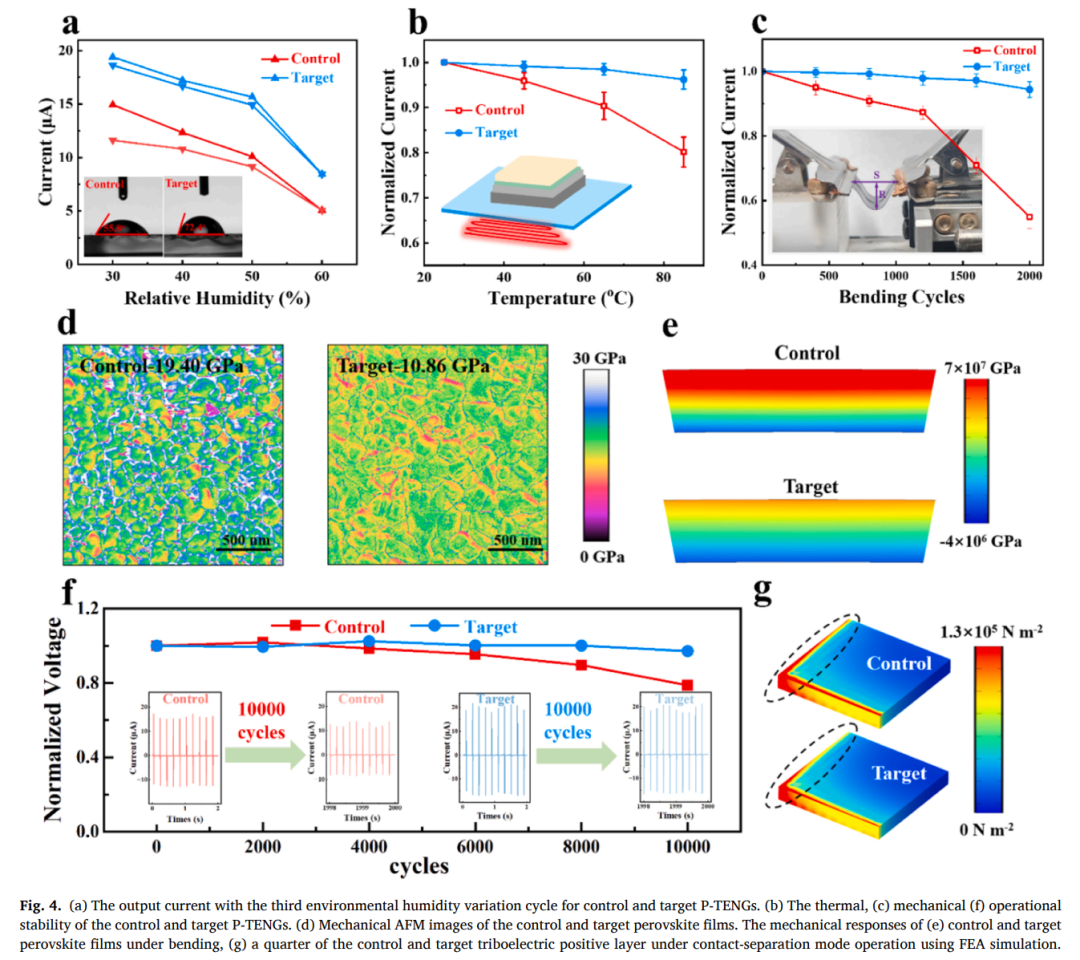 浙江大学张启龙等人引入经空气处理的FAMAPbI₃作为正摩擦电层,并首次提出聚砜(PSU)可辅助形成高质量钙钛矿薄膜。PSU可附着于钙钛矿晶界,作为多功能改性剂优化能级对齐、提升介电常数并钝化薄膜缺陷。实验结果表明,目标P-TENGs通过光电与摩擦电耦合效应实现20.0 μA输出电流与285 V输出电压。作为自供电光探测器,其平均光响应值达14.26 μA/W和119.67 V/W。此外,PSU能赋予脆弱的钙钛矿晶界热稳定性、防水性和韧性。因此,在宽范围湿度条件(30-60% RH)、85°C加速老化、2000次弯曲循环及10000次机械冲击循环下,器件整体稳定性显著提升,输出性能保持在初始值的90%以上。此外,本研究构建了可穿戴自供电光电探测器用于无线控制,该探测器能根据光照强度调节智能窗状态。这项工作展示了一种实现柔性P-TENGs高性能与强韧稳定性兼备的简易方法,有望在协同能量采集器及电子设备的自供电无线控制领域大放异彩。