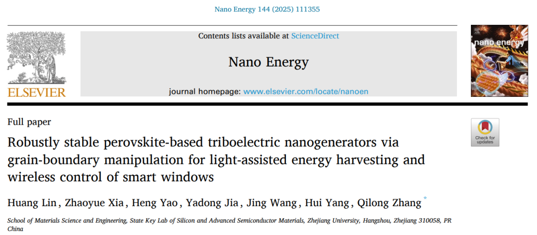 Huang Lin, Zhaoyue Xia, Heng Yao, Yadong Jia, Jing Wang, Hui Yang, Qilong Zhang, Robustly stable perovskite-based triboelectric nanogenerators via grain-boundary manipulation for light-assisted energy harvesting and wireless control of smart windows,