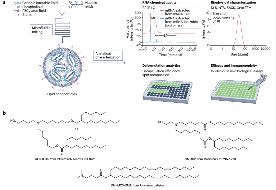 脂质纳米颗粒(LNP)是一种由离子化脂质、胆固醇、磷脂和聚乙二醇化脂质组成的纳米级药物递送系统,广泛应用于RNA药物的体内递送。在新冠疫情期间,LNP技术助力mRNA疫苗的快速开发和大规模生产,展现出巨大的应用潜力。然而,LNP的多组分和复杂性也带来了质量控制和安全性方面的挑战。为了确保RNA–LNP药物的可重复性、稳定性和安全性,需要在研发和商业化过程中建立全面的分析检查点,以多层面表征LNP。