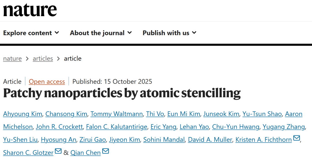 2025年10月15日,相关论文以题为“Patchy nanoparticles by atomic stencilling”发表在Nature上,并在"News and Views" 中highlight 报道。(2016-2022,伊利诺伊大学香槟分校博士生)Ahyoung Kim博士(现为加州理工博后)、伊利诺伊大学香槟分校博士生Chansong Kim、 密歇根大学Tommy Waltmann博士为共同第一作者,陈倩教授、Sharon C. Glotzer教授、Kristen A. Fichthorn教授为共同通讯作者。