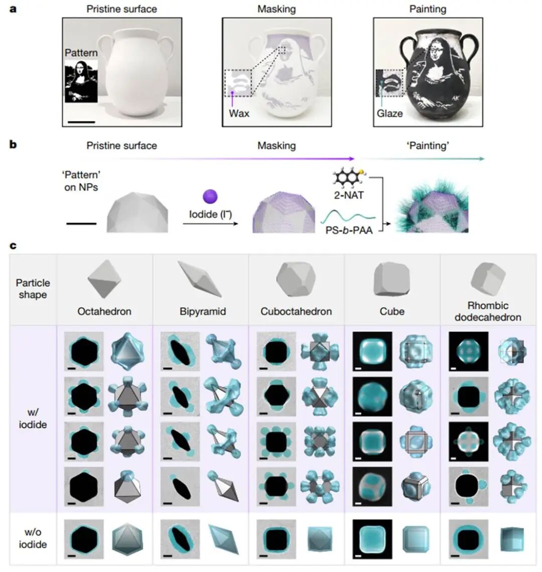 展示了宏观尺度上的传统模板法示例,其中蒙娜丽莎剪影形的遮盖物被应用于任意弯曲的陶器表面并进行涂绘(图1a)。蜡质的遮盖区域排斥水性墨水,从而在绘画上呈现复杂的图案。同样,纳米颗粒表面的模板法通过两个步骤实现(图1b)。在遮盖过程中,按照先前文献合成的原始纳米颗粒与碘化钠一起混合。已知卤素离子会吸附在金属表面,并且广泛用作纳米颗粒合成的形状改性剂,但尚未用于分子图案化。在三种卤素离子(即氯化物、溴化物和碘化物)中,碘化物与金表面的结合最强,即使在彻底清洗后也能抵抗从金表面的去除,从而提供了稳定的遮盖。碘化物混合吸附在脱气的水和氢氧化钠中精确控制,随后对纳米颗粒进行清洗,因为过量的碘化物可能导致金纳米颗粒的不必要蚀刻。接下来,碘化物遮盖的纳米颗粒与2-NAT的疏水性短链硫醇配体和聚苯乙烯-b-聚丙烯酸(PS-b-PAA)在二甲基甲酰胺(DMF)和水中混合,并在固定温度下加热2小时以完成聚合物接枝。2-NAT覆盖未遮盖区域并使其具有疏水性,允许聚合物的聚苯乙烯(PS)嵌段物理吸附,从而"涂绘"暴露的金表面。尽管在碘化物遮盖过程中存在其他卤素离子,但它们对聚合物斑块的形成影响可以忽略不计。本文使用溴化物和氯化物作为遮盖剂的对照实验产生非斑块状纳米颗粒。