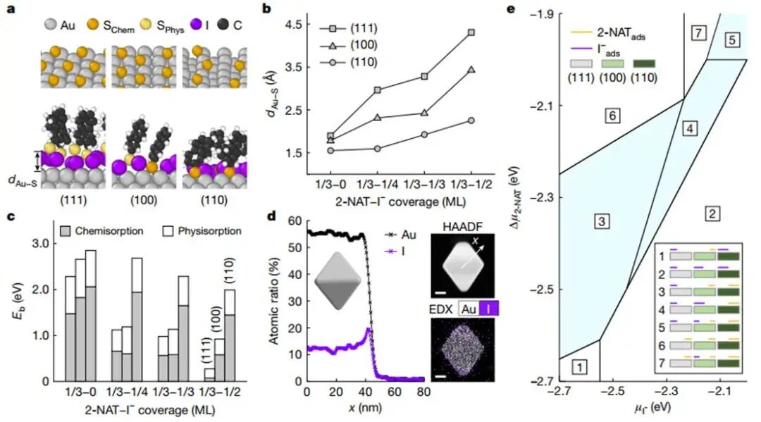 原子尺度的DFT计算显示,碘化物在金纳米颗粒表面的吸附导致2-萘硫醇配体的晶面选择性结合,受碘化物和配体浓度控制。实验上,碘化物预计会在金属表面氧化成碘;本文将这一考虑纳入DFT模型,并将此过程称为碘化物吸附。本文在颗粒中观察到的金(111)、(100)和(110)低能晶面,根据纳米颗粒的形状,这些晶面可以是大的(面)或小的(顶点),这一观察结果将在下文中变得重要。本文的DFT计算预测,在所有考虑的条件下,Au(111)晶面都被碘化物优先遮盖(图2a-c,e)。图2a说明了在2-萘硫醇覆盖度为1/3单层(ML)和碘化物覆盖度为0和1/2 ML(分别为上图和下图)时,碘化物对2-萘硫醇吸附的影响。在没有碘化物的情况下,2-萘硫醇靠近所有金表面(图2b)并形成强化学键(图2c)。随着碘化物覆盖度的增加,所有表面的Au-S距离dAu-S都增加,但(111)表面的dAu-S增加最大,其次是(100)表面,然后是(110)表面(图2b)。同时,随着碘化物覆盖度的增加,可归因于化学吸附的结合能比例在Au(111)上减少最多,在Au(110)上减少最少(图2c)。通过碘化物混合吸附的金纳米颗粒的能量色散X射线光谱(EDX)映射实验证实了碘化物在金纳米颗粒上的强吸附(图2d)。X射线光电子能谱(XPS)和拉曼光谱证实,增加[I-]导致更高的碘化物吸附和更少的2-萘硫醇涂层在纳米颗粒表面。(图2e)展示了一个相图,根据碘化物和2-萘硫醇在所有三种金表面上吸附的平衡表面构型,划分为不同区域,对应不同的化学势μI-和μ2-NAT。对于2-萘硫醇,本文只包括化学吸附构型。本文观察到2-萘硫醇部分或完全物理吸附的构型(图2a),但假设弱结合的物理吸附2-萘硫醇不会保留在纳米颗粒表面,不能为聚合物提供稳定的接枝位点(图2c)。