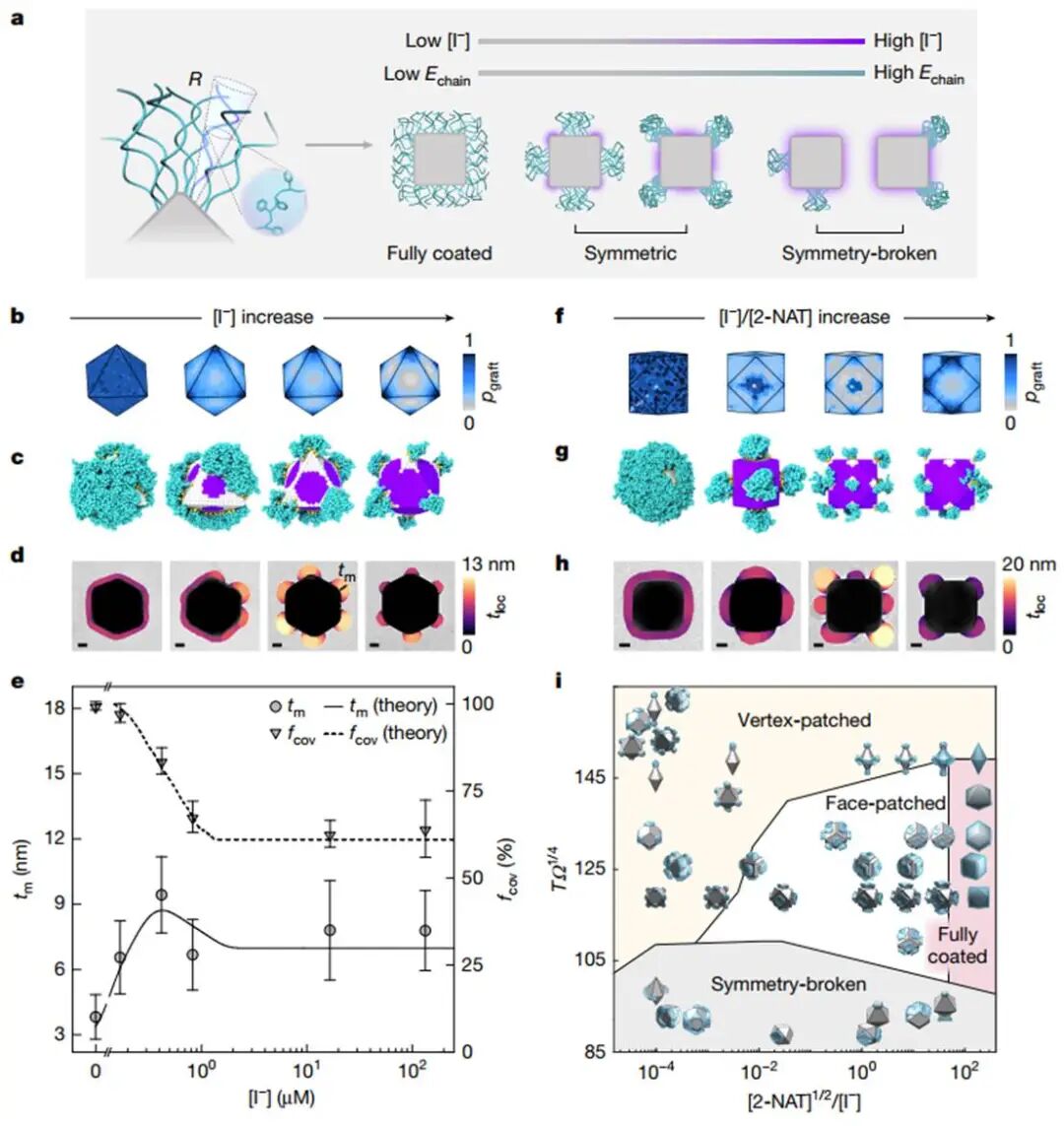 尽管碘化物遮盖决定了可用于聚合物接枝的金纳米颗粒晶面,进而影响斑块图案,但作为斑块的PS-b-PAA嵌段共聚物经历微观相分离,其大小与核心纳米颗粒的尺寸相当。因此,本文预计与聚合物相关的焓效应和熵效应会在可用的接枝位点集合内进一步精细调节纳米颗粒上的斑块图案和斑块大小。为了解释这些效应,本文开发了一个多尺度建模流程,将原子级的DFT模型与介观尺度的聚合物行为联系起来。本文首先构建了一个碘化物遮盖的统计力学吸附模型,该模型输入DFT计算的结合能,从而确定了可用于每种类型晶面上聚合物接枝的表面结合位点的化学计量比。通过这种方式,本文将单个晶面的DFT计算直接映射到3D纳米颗粒形状上,从而量化表面遮盖如何影响控制链构象的热力学(图4a)。微观上,相邻的接枝聚合物引起拥挤,导致链伸展和大的熵惩罚。同时,链伸展促进了有利的PS-PS相互作用。这种构象熵和链间吸引力Echain之间的竞争决定了未遮盖纳米颗粒表面位置上接枝聚合物链的自由能。使用这种多尺度建模方法,本文预测了斑块行为随实验相关参数的变化,包括纳米颗粒形状、纳米颗粒局部表面曲率Ω、[I⁻]、接枝浓度和温度T。在没有碘化物和过量[2-NAT]的情况下,本文的模型预测纳米颗粒被聚合物完全覆盖(图4b,f),与实验结果一致。引入碘化物模板后,接枝链不能再自由探索纳米颗粒表面,而是被限制在由遮盖物限定的区域内。以八面体为例,本文在模型(图4b)、分子动力学模拟(图4c)和实验(图4d)中都发现形成了顶点斑块。