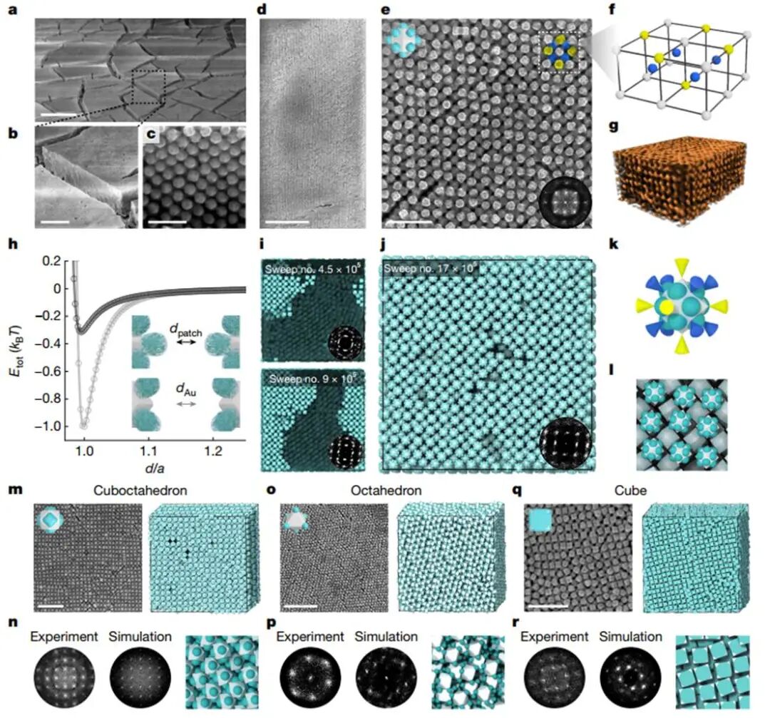 图4. 与实验观察一致的多尺度理论和分子动力学模拟 证明了模板法对斑块图案和斑块尺寸的可调性和可预测性 斑块状纳米颗粒溶液的受控蒸发导致形成具有大颗粒间距的超晶格(图5a-g)。以四种斑块状纳米颗粒为构建块(面块菱形十二面体、面块立方八面体、顶块八面体和面块立方体),它们的超晶格具有单晶畴,延伸数百微米甚至毫米,若不是在干燥过程中形成的裂纹,这些畴会更大。这些超晶格呈现体心立方(BCC)或体心四方(BCT)对称性,这与相同形状的原始纳米颗粒形成的密堆积晶格不同。本文的蒙特卡洛(MC)模拟预测了这些超晶格,并揭示了精确图案化的斑块之间的方向性相互作用是获得这些开放结构的关键(图5h-r)。以面块菱形十二面体为例。它们有12个面块和14个遮顶,因此本文提出每个粒子将倾向于在其第一和第二邻壳中有14个粒子,且具有吸引力的顶点对齐(图5k)。超晶格的俯视图显示在一个二维(2D)方形对称晶格层中,颗粒间距为77.5±6.9纳米(纳米颗粒尺寸的1.56倍)(图5e)。单粒子分辨率的X射线断层扫描三维重建确认了BCC超晶格,在z方向上超过数十层(图5g)。在不同基底上成功形成相同的超晶格表明,颗粒间相互作用而非基底效应主导了组装过程。BCC超晶格的体积分数低至0.31,这与从原始菱形十二面体组装的空间填充面心立方超晶格形成鲜明对比。本文计算了不同相对取向下面块菱形十二面体对的平均力势(图5h)。使用这些相互作用的势能进行MC模拟揭示,最初随机取向的斑块状纳米颗粒重新取向,产生具有长程有序的BCC晶格(图5i,j)。正如所建议的,BCC晶格通过形成一个晶胞来稳定,该晶胞特征为中心有一个斑块状纳米颗粒,周围环绕着八个最近邻和六个次近邻,这在模拟和实验组装中都是如此(图5f,k,l)。 图5. 斑块状纳米颗粒大规模自组装形成开放超晶格