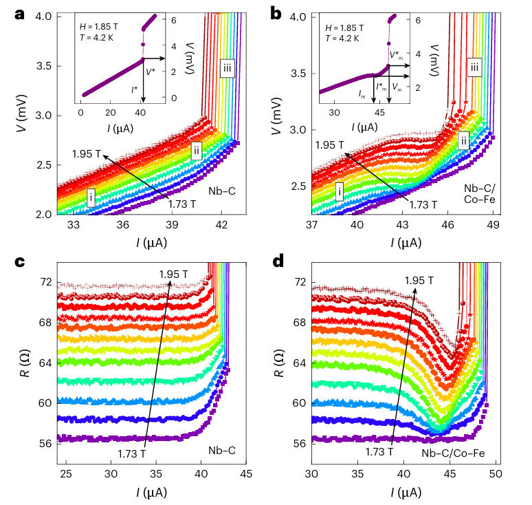 实验采用Nb-C超导条带(45 nm厚)与Co-Fe铁磁波导(30 nm厚),两者通过3 nm厚的绝缘Nb-C层隔离,以避免电耦合但保留磁耦合。实验在4.2 K低温下进行,通过施加1.75–1.95 T的倾斜磁场,在超导条带中形成周期性涡旋晶格。当沿条带通入直流电流时,涡旋受洛伦兹力作用高速运动,其动态杂散场激发Co-Fe层中的自旋进动,产生磁振子。磁振子信号由微波梯状纳米天线在2微米外探测,并通过频谱分析仪记录。电流-电压曲线中出现的“恒压台阶”证实了涡旋与磁振子的相干耦合。