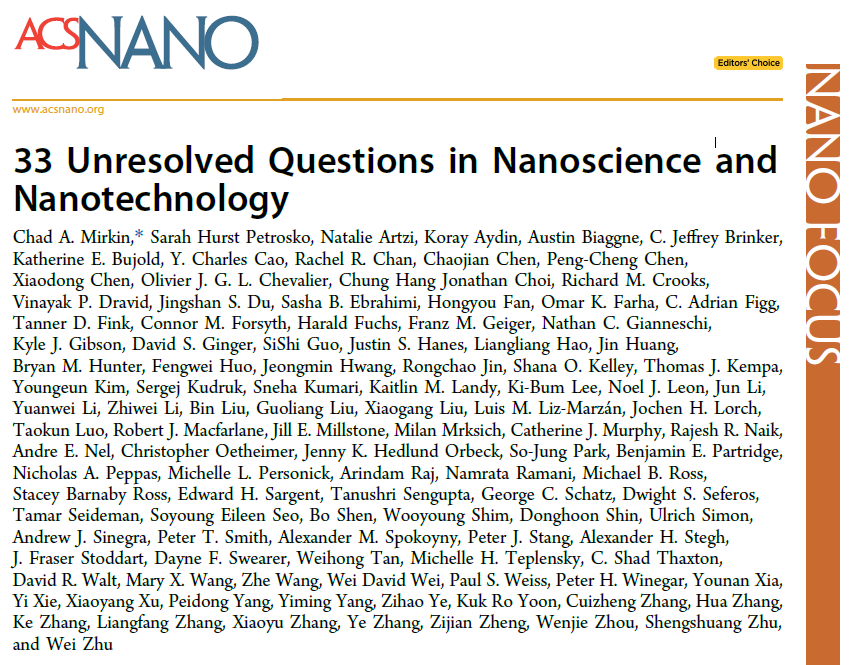 近日,由美国西北大学Chad A. Mirkin教授领衔,集结全球百余位纳米领域顶尖科学家联合撰写的33 Unresolved Questions in Nanoscience and Nanotechnology在ACS Nano正式发表。