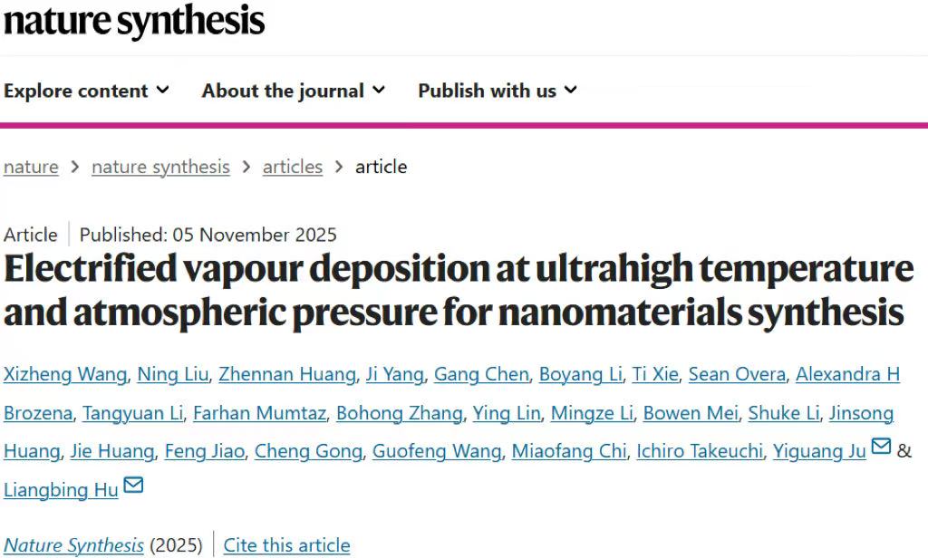 相关研究成果以“Electrified vapour deposition at ultrahigh temperature and atmospheric pressure for nanomaterials synthesis”为题发表在Nature Synthesis上。
