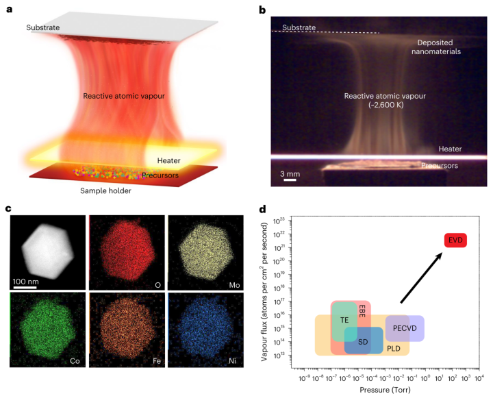 这项研究提出了一种利用电加热实现高温、高通量、高活性原子蒸汽稳定流动的气相沉积方法,用于合成多种材料,包括多元合金、硫化物、氧化物和薄膜涂层。与热蒸发、等离子体增强化学气相沉积(PECVD)、火焰合成等其他常见的气相合成方法相比,电子气相沉积(EVD)提供了一种更具规模化潜力的超高温活性原子蒸汽生成方法。更重要的是,EVD可在大气压下进行,同时保持高温、高通量(1021–1022个原子/cm2/s)和定向流动,从而提供了一种更便捷的方法,可在数秒内制备晶体、多元和功能性纳米材料和涂层,这有助于快速筛选新型材料和形貌。相比之下,其他气相沉积方法通常在真空(通常< 10-1 Torr)下进行,以降低汽化物质的密度和表面扩散通量,并形成扩散限制的反应过程,从而实现晶体材料的沉积。
