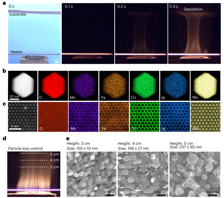 美国耶鲁大学胡良兵教授、普林斯顿大学琚诒光教授等研究人员合作提出了一种“电加热气相沉积(EVD)”的方法,该方法能够快速将多种前驱体汽化为原子物种,从而实现纳米材料和薄膜的连续合成和快速生长。该工艺得益于一种反应器设计,其中固态前驱体被半封闭在带电碳纸加热器下方,该加热器可在常压氩气环境下以极快的速率(~104 K s-1)达到超高温(~3000 K)。高温使前驱体快速汽化和分解,产生高通量、高活性原子物种(1021–1022个原子/cm2/s)的高温气体(~2600 K),该气体从加热器的开口边缘向外扩散,并在浮力驱动下以连续、高度可控的流动向上对流。这种高温蒸汽与周围室温惰性气体的快速混合导致其以约104 K s-1的速率迅速冷却,从而促进了流场中原子物种的成核。通过将较冷的基底放置在加热器上方的临界距离处,无需添加外部催化剂,这些气相物种即可生长成高度均匀、纯净的纳米材料产品和薄膜,并具有优异的成分和结构控制以及可定向沉积的特性。由于汽化的原子物种具有足够高的反应活性,因此EVD可以在大气压下进行,从而在保持扩散限制机制的同时实现高表面扩散通量。这抑制了扩散-反应不稳定性,即原子积累速度超过其反应速度,导致不规则生长和结晶度差的情况。作为概念验证,制备了由Mo45Co25FeyNiyMn30-2yOx(其中y = 10、12.5或15)组成的多元素(五元)单晶纳米圆盘,其中每种元素均匀分布。