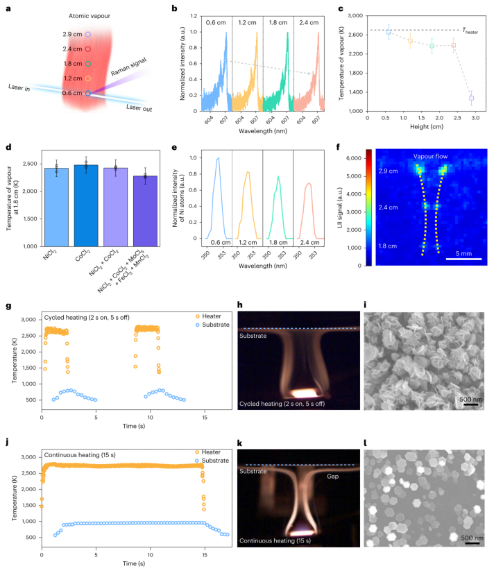 高通量、高反应性原子蒸气的定向流动:生成的蒸气具有极高的通量(1021–1022 atoms/cm2/s) 和高度反应性,能够以定向、稳定的层流形式向上流动,与周围气体快速混合并冷却(~104 K/s),促进成核,可在秒级时间内合成单晶或多元素纳米材料,沉积速率高达 10–20 nm/s。