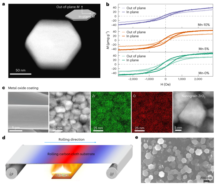 EVD合成的多元素纳米材料在功能应用方面展现出巨大潜力。例如,Mo₄₅Co₂₅Fe₁₀Ni₁₀Mn₁₀Oₓ纳米盘具有可调的磁性性能,其磁滞回线显示随着Mn含量的降低,面内磁各向异性增强。同时,EVD还可用于制备均匀的ZrO₂薄膜和通过卷对卷系统实现大规模生产。这些结果表明,EVD不仅适用于实验室研究,还具备工业化应用的潜力。EVD方法通过在常压下实现超高温、高通量气相沉积,为纳米材料的合成提供了一种高效、可控的途径。其快速加热和冷却速率促进了热力学非平衡结构的形成,拓展了材料设计的空间。未来,结合卷对卷技术和可再生能源,EVD有望在催化、能源等领域推动绿色制造的发展,为复杂纳米材料的制备开辟新的可能性。