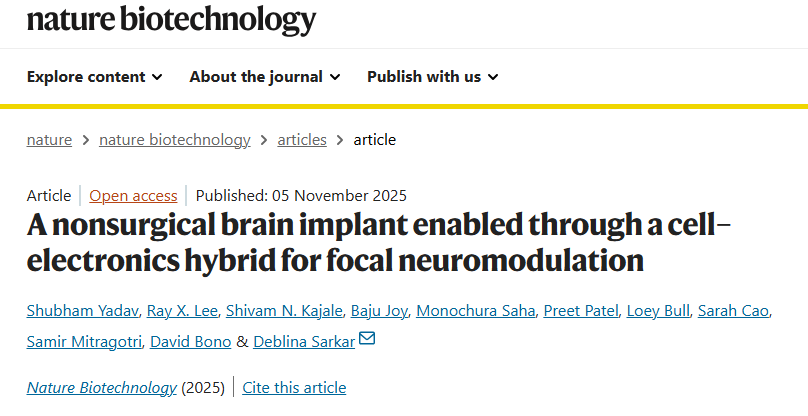 Yadav, S., Lee, R.X., Kajale, S.N. et al. A nonsurgical brain implant enabled through a cell–electronics hybrid for focal neuromodulation. Nat Biotechnol (2025).