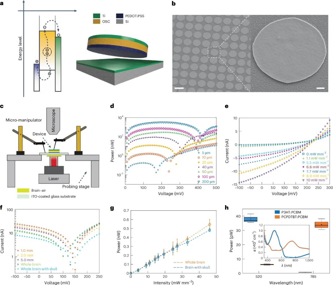 为了使电子设备能够在血管内自由移动并到达脑部,研究团队设计并制造了亚细胞级无线电子设备(SWEDs)。这些设备尺寸极小,能够通过血液循环到达脑部。研究团队采用了有机半导体材料,利用光能进行无线供电,实现了高效的能量转换。实验表明,这些微型设备即使在亚细胞尺寸下(直径小于10微米),仍能产生足够的电能用于神经调控。
