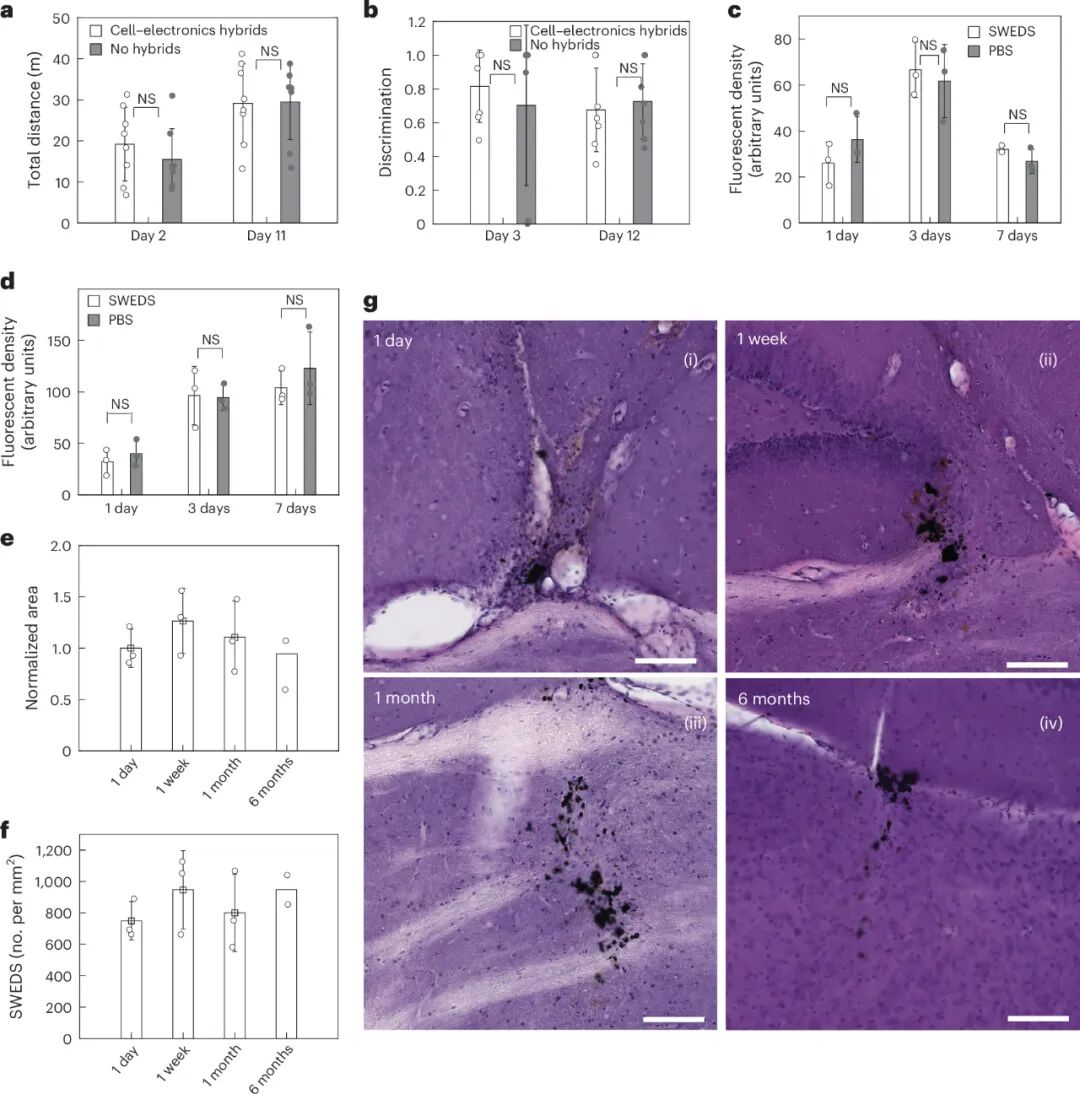 为了评估SWEDs的生物相容性,研究团队进行了体外和体内实验。体外实验表明,SWEDs对单核细胞和神经元的代谢活动没有显著影响。在体内实验中,研究团队观察了SWEDs对动物行为、血液指标和组织形态的影响,结果表明SWEDs具有良好的生物相容性,未引起明显的免疫反应或组织损伤。