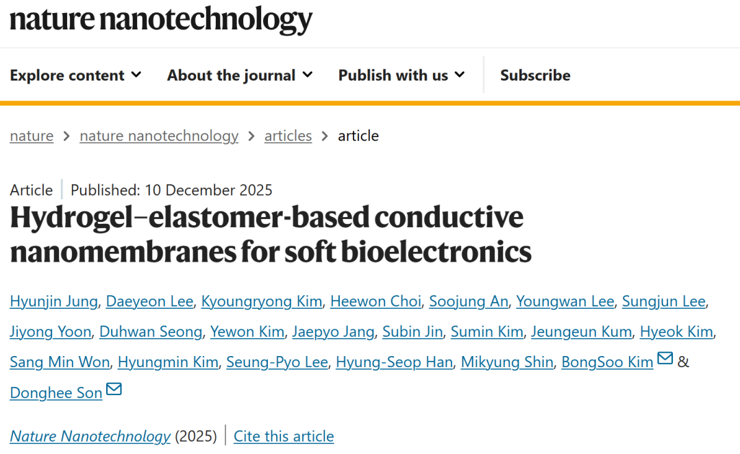 近日,韩国成均馆大学Hyunjin Jung,Donghee Son等联合蔚山科学技术院Daeyeon Lee,BongSoo Kim等在Nature Nanotechnology上发文,开发了基于离子-电子导电纳米膜(THIN),可变形且不可感知的水凝胶-弹性体粘附双层膜,总厚度仅350纳米。