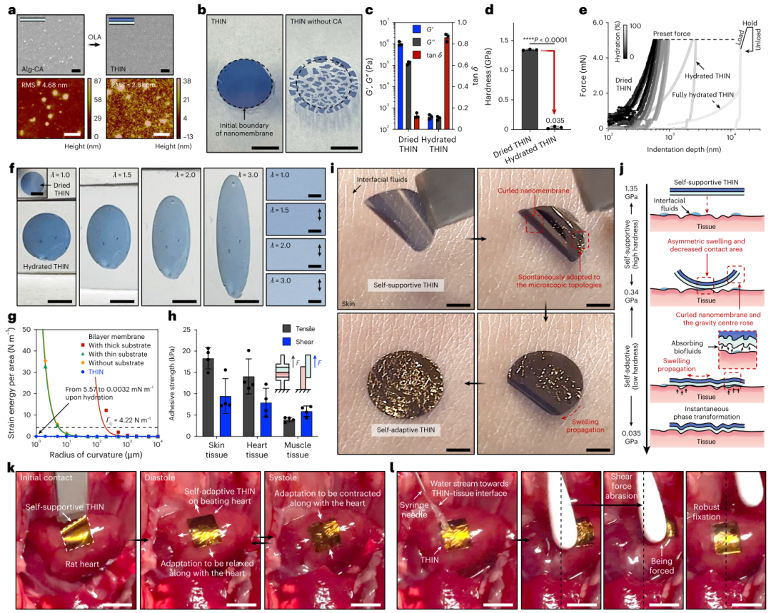 该方法,利用了双亲性特质,结合了亲水的组织粘附性水凝胶与疏水的半导电弹性体。通过正交溶剂旋涂工艺形成的异质界面动态键合相互作用,使其完全兼容微加工。THIN表现出了瞬时的“硬-软”相变,当干燥时容易地处理,实现了从1.35到0.035GPa硬度,以及0.16到9.08×10⁻⁵ GPa·μm⁴刚度转变。在水合时,THIN实现了与不同表面的完全共形接触,包括那些具有低弯曲半径的表面,以及快速自发的粘附性。