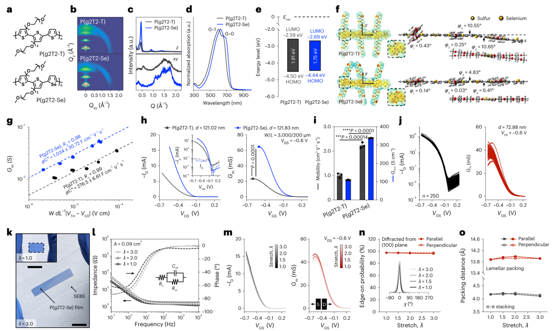图3 | 可拉伸半导体弹性体纳米膜的电学性能。