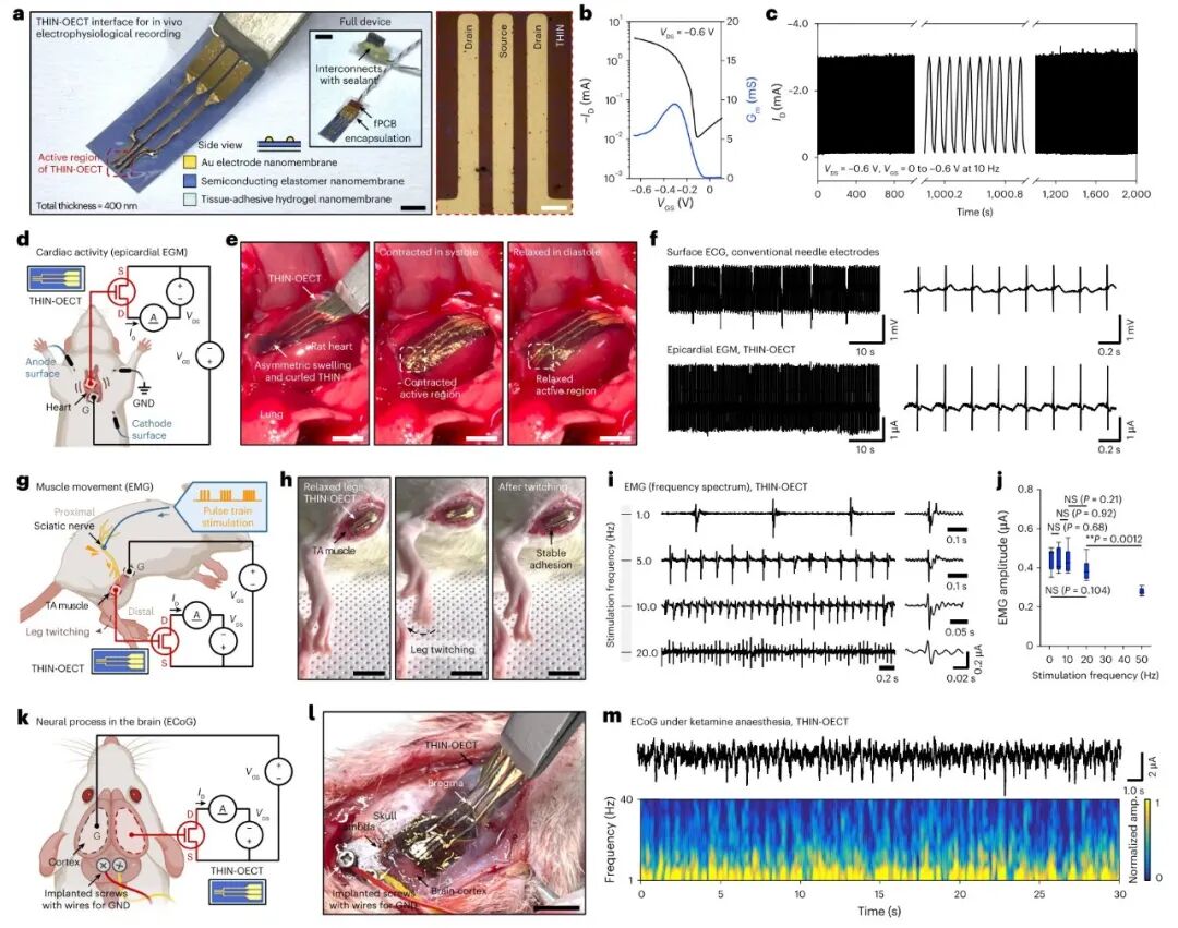 图4 | 用于体内电生理监测的THIN-OECT界面。